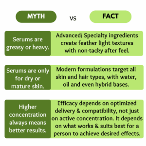 A serum’s effectiveness lies in its structural design. Typically formulated with low viscosity systems, serums allow active molecules – whether hydrophilic or hydrophobic, to interact closely with skin or hair structures. Advanced carriers or messengers that are responsible to establish cell to cell interaction; like liposomes, exosomes or polymers help actives reach the deeper layers of skin or hair effectively, ensuring better results.